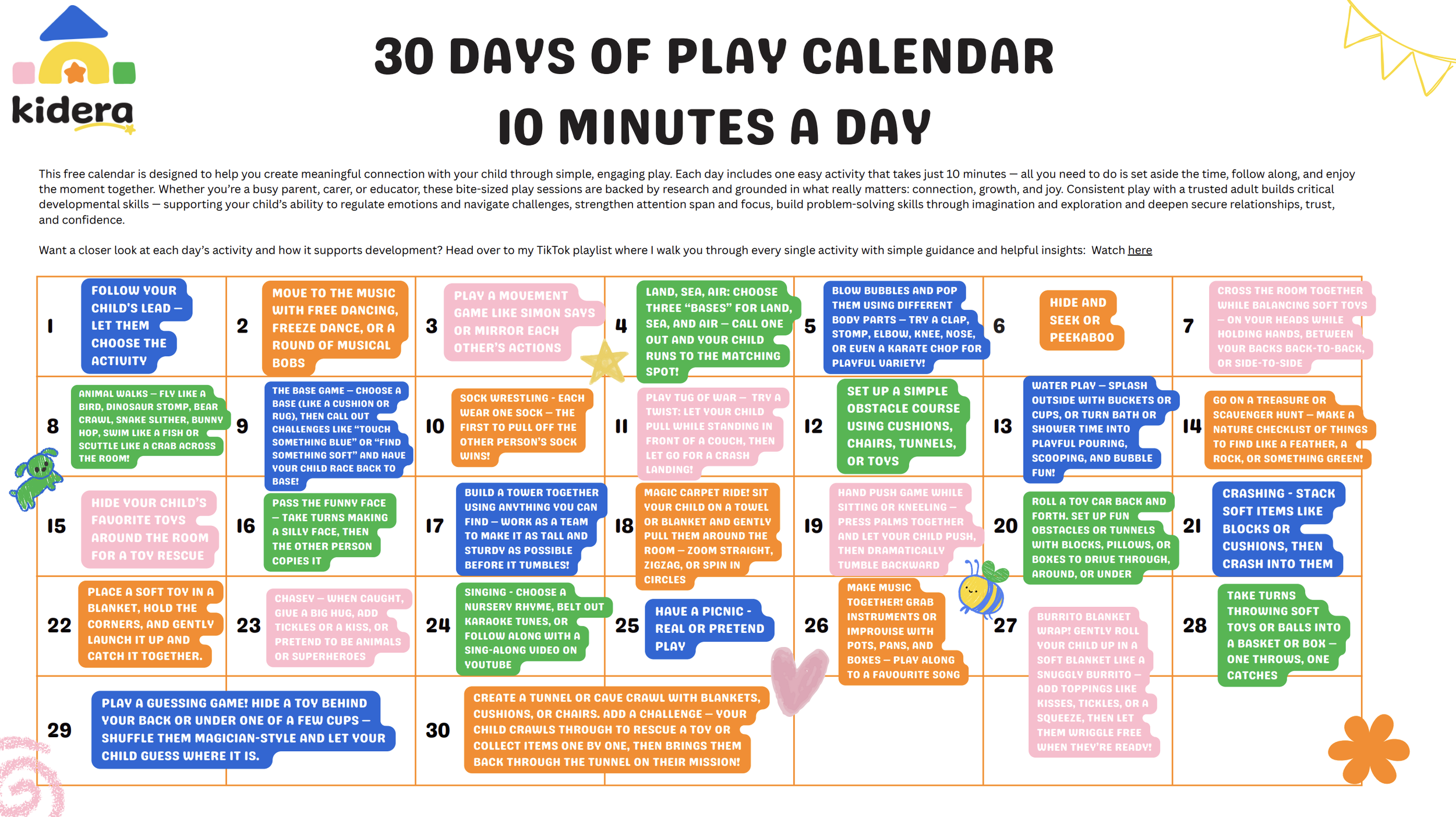 Need easy, engaging activities that spark joy and connection with your little one? Grab your free 30 Days of Play calendar: a collection of playful prompts designed by an OT to inspire bonding, movement, and laughter without any overwhelm. These ideas are simple, screen-free, and developmentally thoughtful.